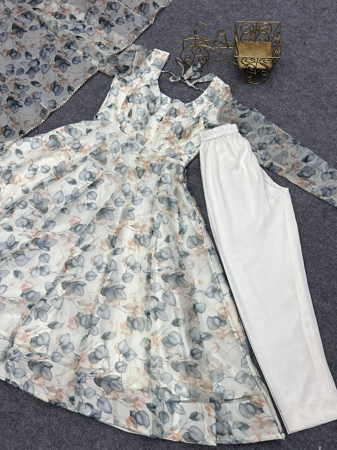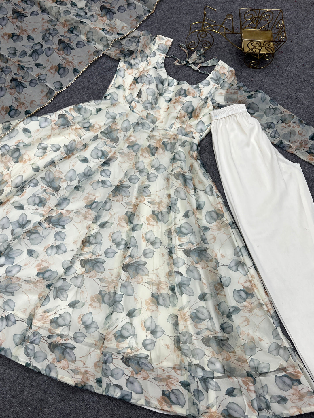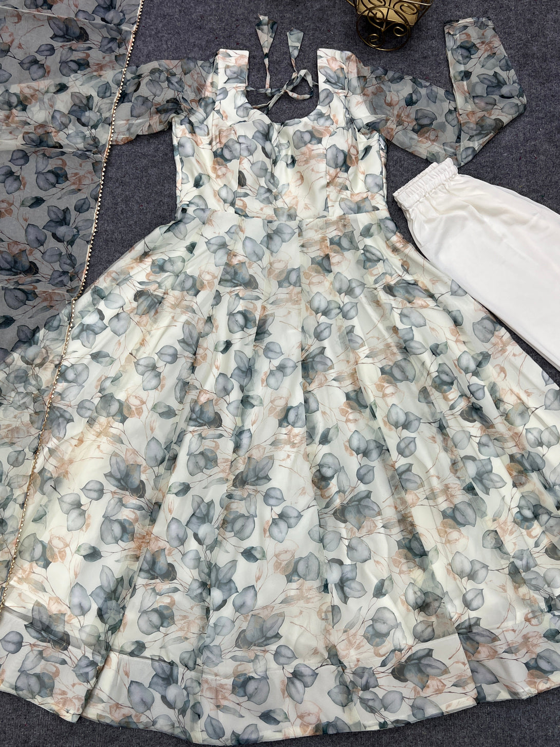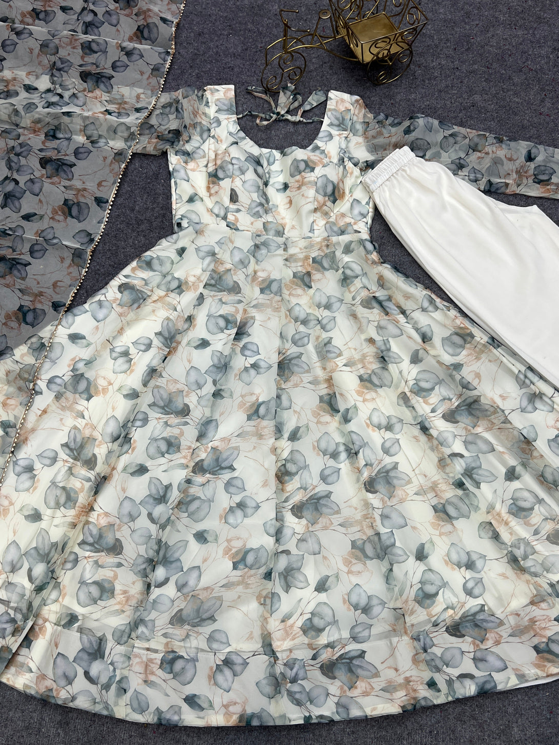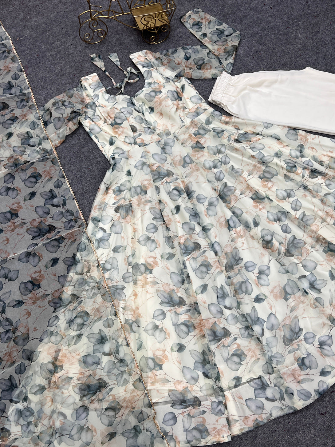 Beautiful Leaf Printed Organza White Color Anarkali Suit