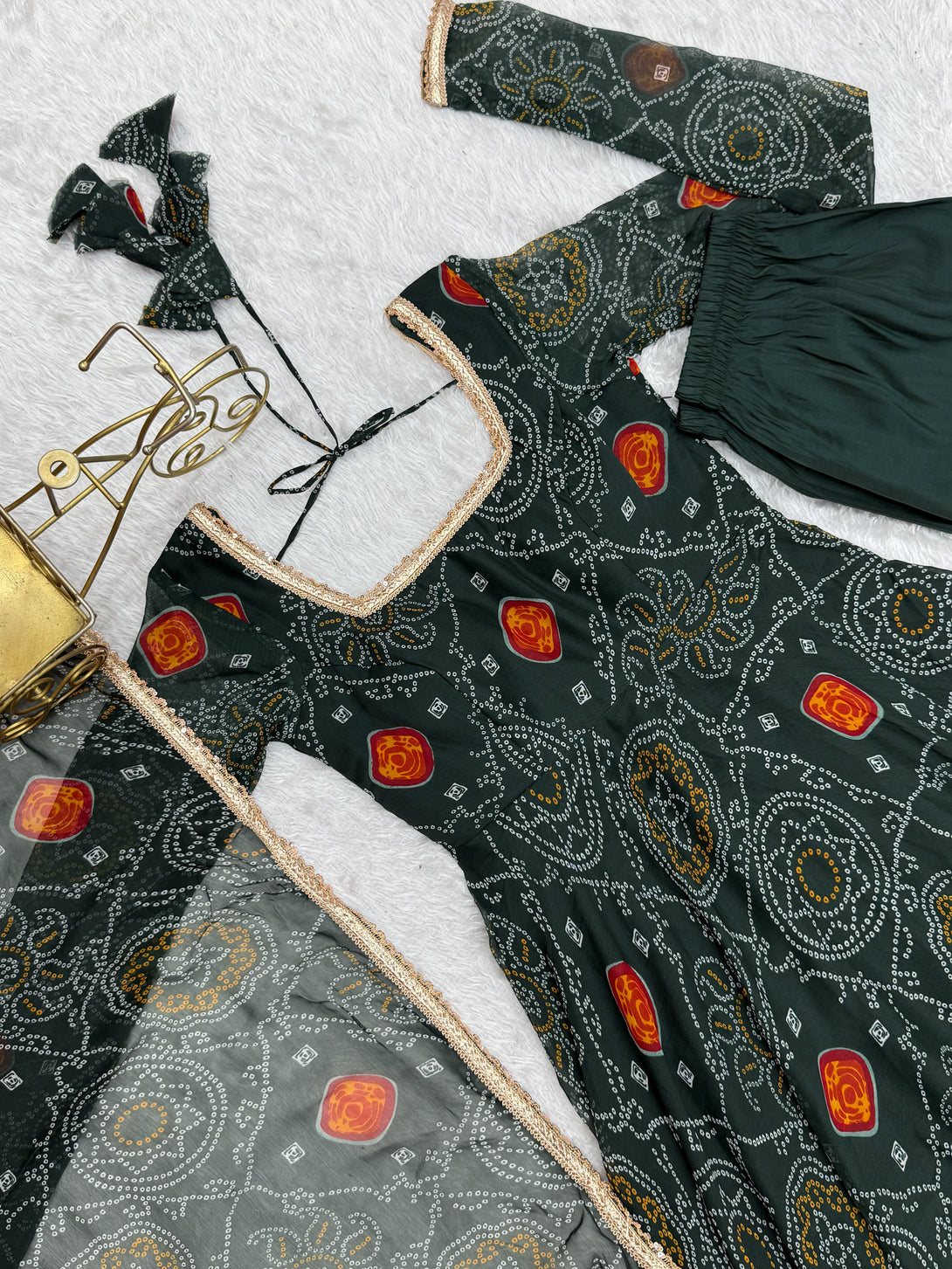 *Presenting New Designer Pure Soft Lightweight Chiffon Bandhej Fully Flair Gown, Duppta, Pent Set Ready To Wear Fully Stitched*